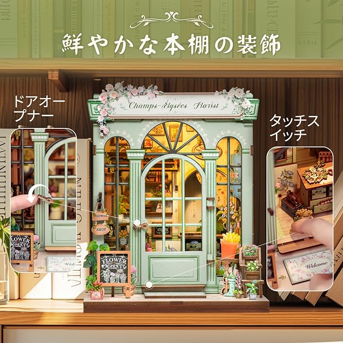 CuteBee DIY ブックヌックキット ドールハウスキットミニチュアハウスキットBookNook 3Dウッドクラフトブックエンド装飾 LED付き ティーンエイジャーと大人向け プレゼントに最適 (シャンゼリゼに花屋)