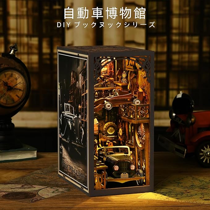 CRESYMME ブックヌック ドールハウス リーズ ミニチュア ハウス ログハウス キット 木製 立体パズル 手作り 大人向け LEDライト付き (自動車博物館)