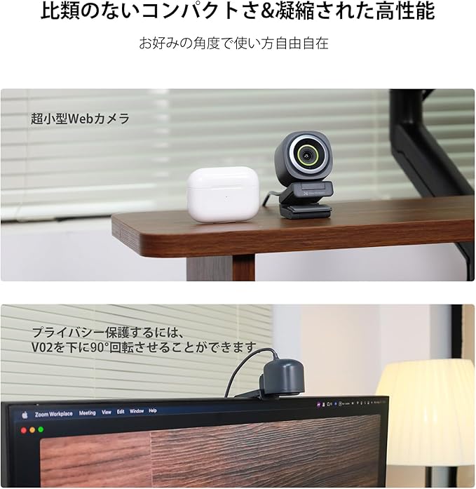 【3通りの設置方法-安定感UP!/下に90 回転-プライバシー保護/テキスト・書類スキャンにサポート】 ノートパソコンやデスクトップパソコンに取り付けられるほか、平面にもピタッと設置可能です。底面には三脚穴(1/4インチねじ)があるので、スタンドに取り付けられます。高さや向きを調節しやすく、手元を映したい時などに便利です。カメラが内蔵されていないモデルのパソコンでもビデオ会議やライブ配信をおこなうことができます。V02AFを手動で回転させたり、下に傾けたりしてプライバシーを守ることができます。書類をデジタル化するためのスキャンカメラとしても使用可能。