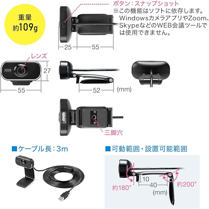 サンワダイレクト WEBカメラ マイクなし 画角60度 フルHD 1080P 200万画素 三脚対応 Zoom/Teams対応 ケーブル3m 1個 400-CAM086