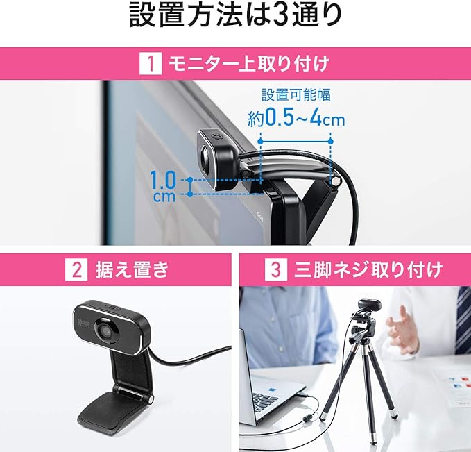 ノートパソコンやデスクトップPCのディスプレイに取付可能なスタンド付きです。また、カメラ底面にカメラ用三脚ネジ(UNC1/4インチネジ)を内蔵で、市販のカメラ三脚に取り付けできます。(※カメラ三脚は別売)