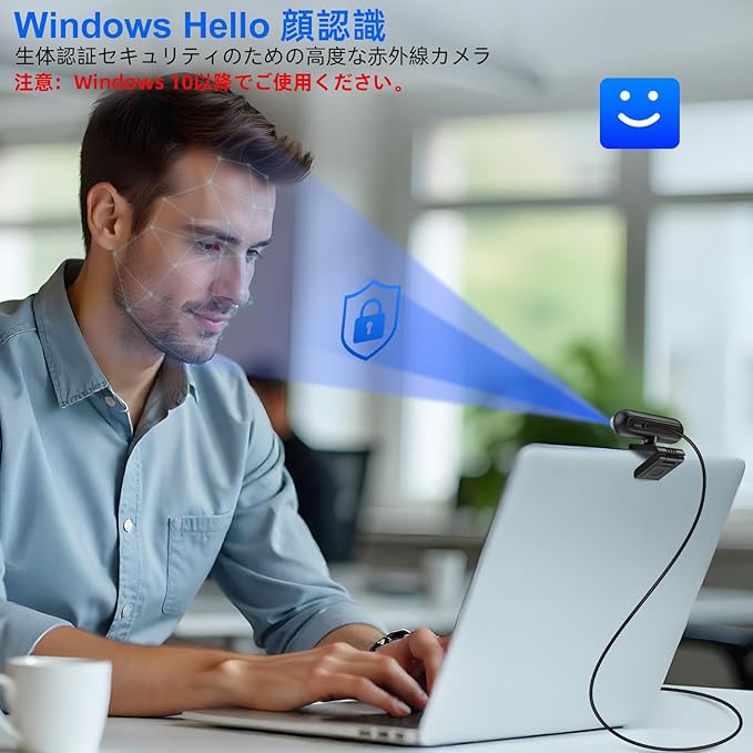 Windows Hello顔認識カメラ:このウェブカメラはWindows 10/11のWindows Helloに対応しており、顔認識により素早く簡単にコンピューターのロックを解除できます。ヒント:コンピューターのロックを解除するには、通常の照明条件でウェブカメラから顔を50~60cm離してください。注意:Windows 10以降でご使用ください。