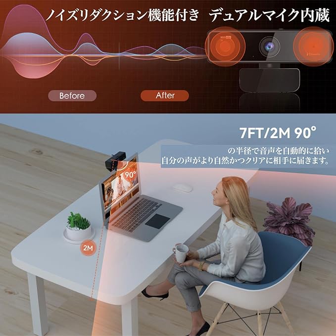 「AIノイズリダクション機能付きのデュアルマイク内蔵 ノイズ低減ウェブカメラ」カメラの両側に1台ずつ、計2台のマイクを搭載。AIノイズリダクション機能付きのデュアルマイクが90 以外の不要なノイズを除去することで、2メートル/ 7フィートの半径で音声を自動的に拾い、自分の声がより自然かつクリアに相⼿に届きます。コミュニケーションをもっと快適に楽しめます。騒がしい環境でも、必要なサウンドをキャプチャできます。4人以内の参加者とのミーティングに最適です。