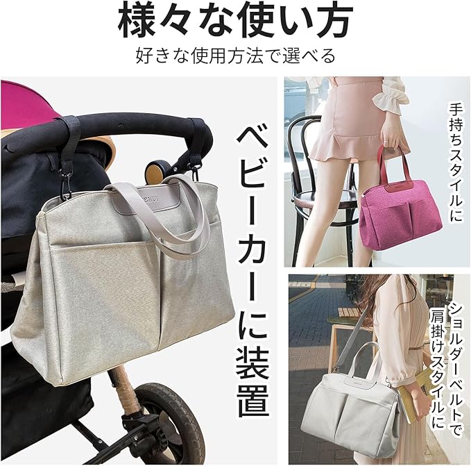 【様々な場面で】ベビーカー用バッグ以外にもいろいろ便利に使えます。ファッション性と実用性を兼ね備えたトートバッグでマザーズバッグ、ジムバッグ、旅行バッグ、ゴルフバッグ、スポーツバッグなどとしてピッタリ!このベビーカーのオーガナイザーバッグは、新しいお母さんに最適なベビーギフトです。