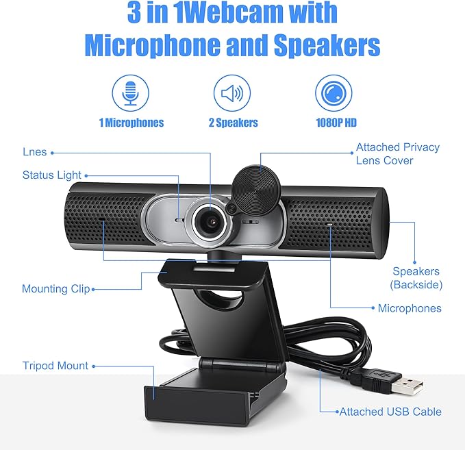 ウェブカメラ(マイク・スピーカー内蔵)|1080P デスクトップ/ノートPC用 USB接続 物理プライバシーカバー付き プラグ&プレイ ストリーミング対応 広角レンズ 3-in-1