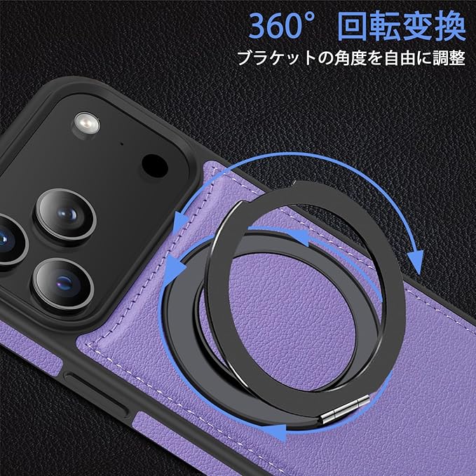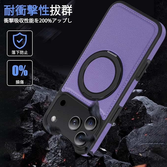 iPhone 17 Pro Max 用ケース Magnetic対応 リング付き 耐衝撃 レンズ保護 アイフォン17 pro max 用ケース マグネット搭載 360 回転 PC+PUレザー 衝撃吸収 スタンド機能 黄変防止 シンプル スマホカバー 紫 J15-47