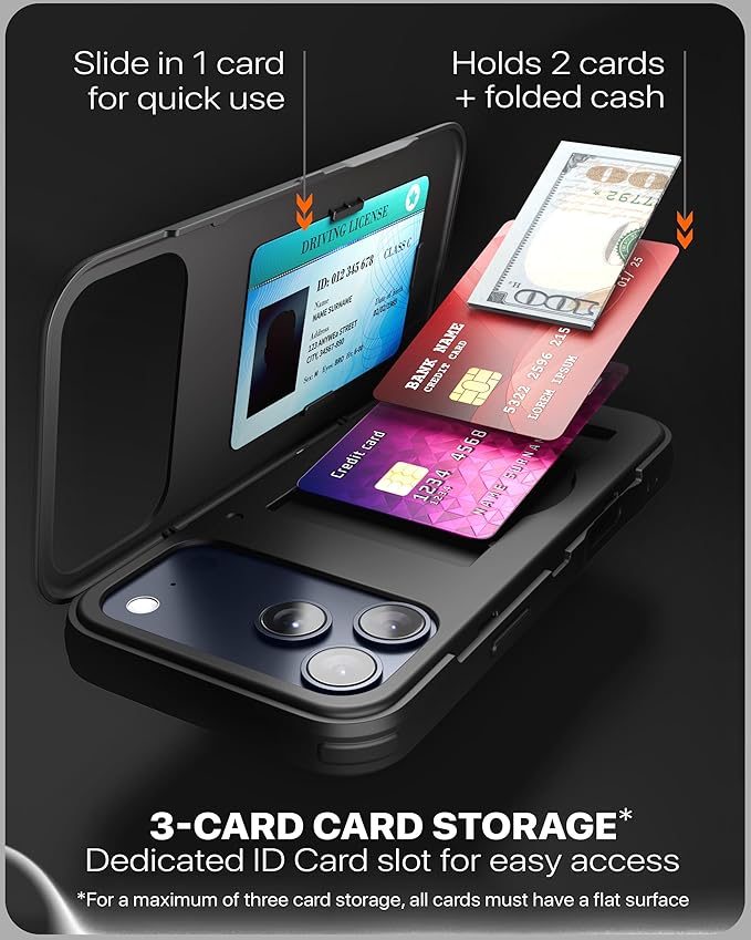 TORU CX SLIM iPhone 17 Pro Max用ケース | スリムウォレットケース、隠し3枚カードホルダー&カードスロット付き | 耐衝撃性、頑丈なカバー、フリップキックスタンド付き | ミラー&ストラップ付き - 黒