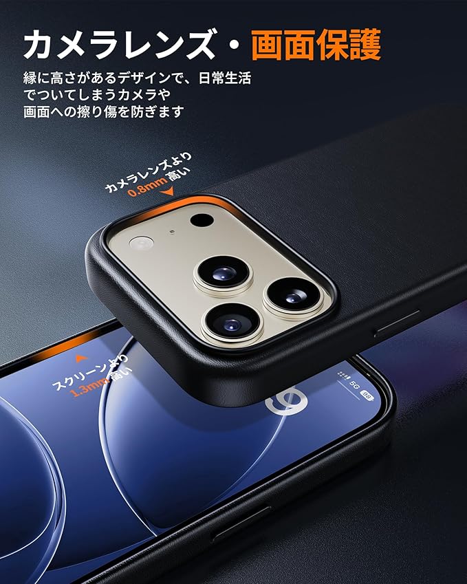 【カメラレンズ・画面保護】ケースの縁は、液晶画面より1.3mm高く、カメラレンズより0.8mm高いため、テーブルに置いても画面やカメラレンズに接触することなく、摩擦などからiPhoneをしっかり守ります。