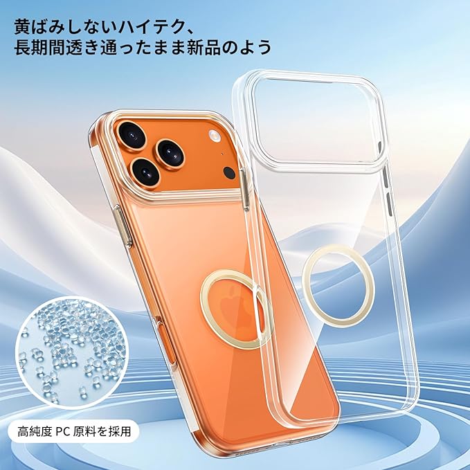 【黄変しないテクノロジー】 この iphone 17 pro max case は高純度 PC 素材に抗黄変成分を配合。長時間の日光や使用にも色あせず、透明感を長く保ちます。いつまでも新品のような美しさをキープ。