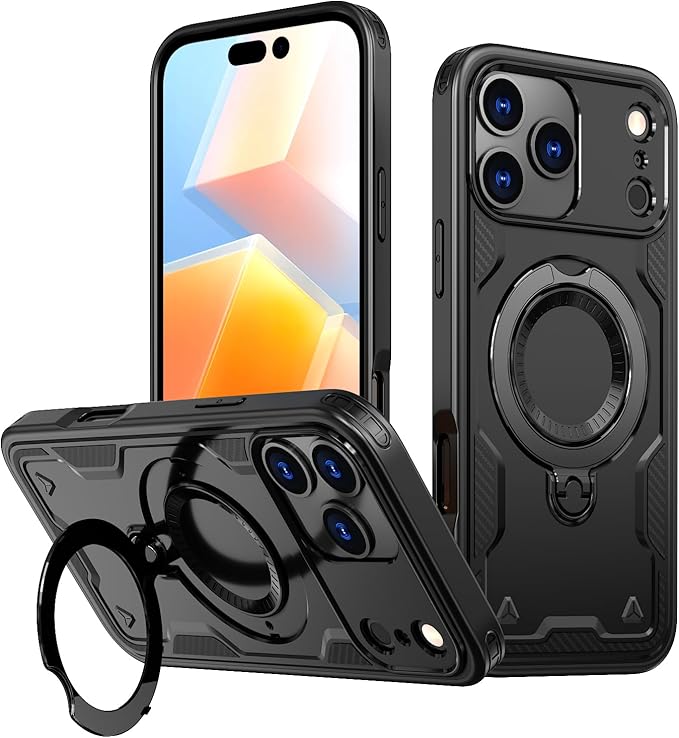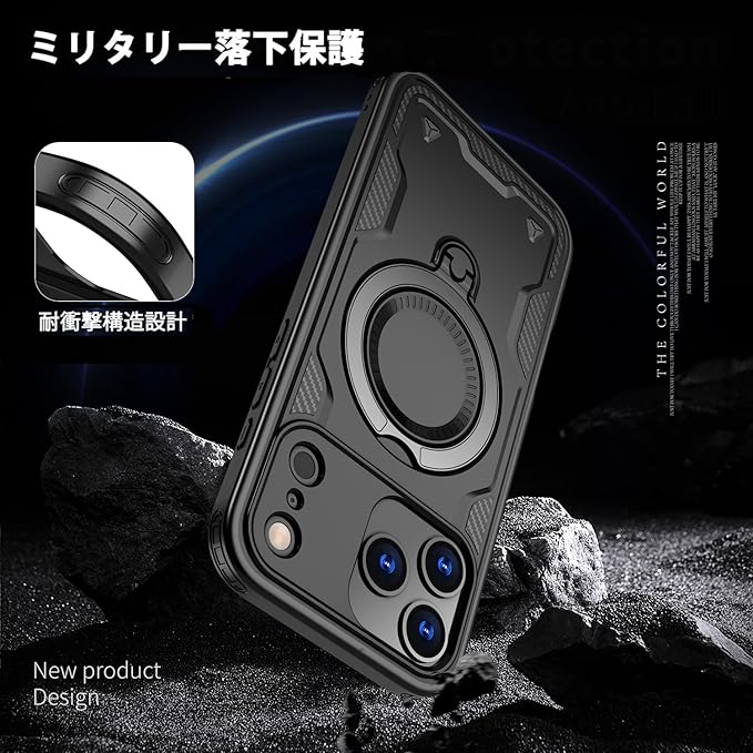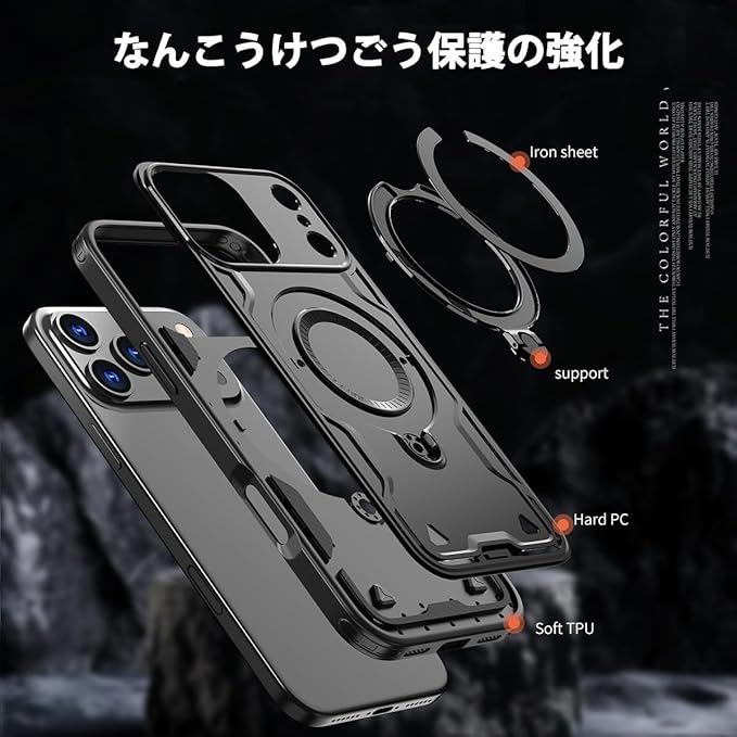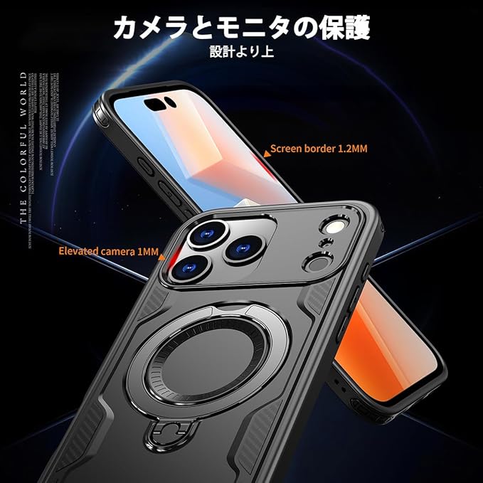 iPhone 17 Pro Max 用ケース MagSafe対応 磁気吸着 ワイアレス充電対応 360 回転リング スマホケース 縦横両対応 スタンド機能 米軍MIL規格取得 耐衝撃 Case Cover アイフォン いphone17promax 17プロマックス 対応 背面 カバー レディース メンズ(ブラック)