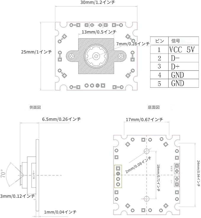 【商品仕様】材料:PCB;製品チップ:GC2154(1/5インチ)の場合;最大解像度フォーマットフレームレート:1280x720 mjpeg 20fps、1600x1200 yuy2 5fps;視野の最大フィールド:72度歪みなし;アナログマイクに組み込まれています;テストライン:4P-2.0mm-40cm;パッケージリスト:1 xカメラモジュール。