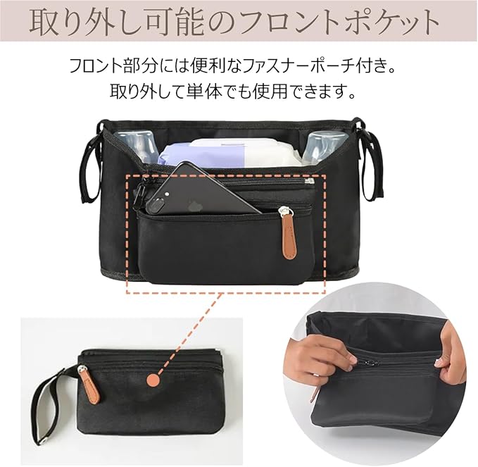 【取り外し可能のポケット】 フロント部分には便利なファスナーポーチ付き。取り外し可能で単体でも使用できます