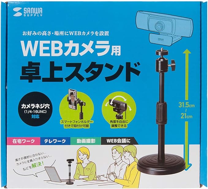 ●お好みの高さに調節できる卓上のWEBカメラ用スタンドです。●テレワークやWEB会議、動画撮影などの際に大変便利です。●スマートフォンを取り付けできるホルダー付きです。●ボールジョイントを採用し、お好みの角度に調整できます。●重さのある台座で安定感抜群のスタンドです。倒れる心配なくご使用いただけます。