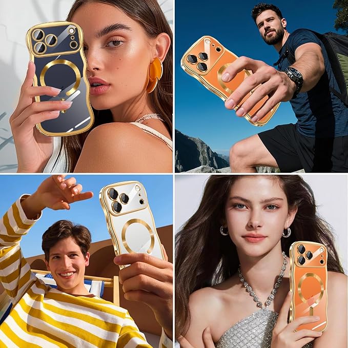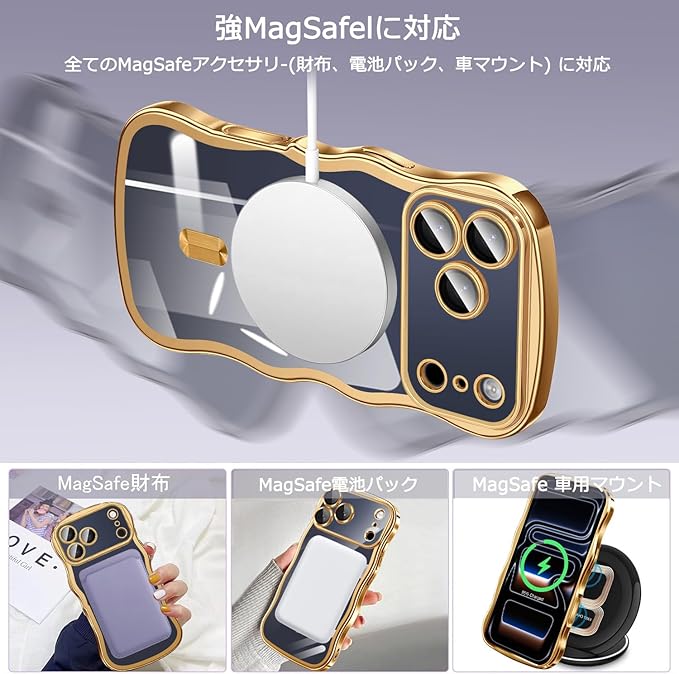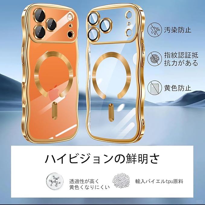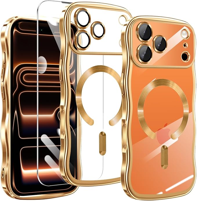 for iPhone 17 Pro Max 用 ケース クリア MagSafe対応【 HDフィルム付き 】薄型 軽量 波型 ワイヤレス充電対応 TPU ウェーブデザイン ソフト 滑り止め 可愛い 耐衝撃 おしゃれ うねうね バンパー スマホケース ストラップホール付き アイフォン 17 プロ マックス 対応 カバー(ゴールド)