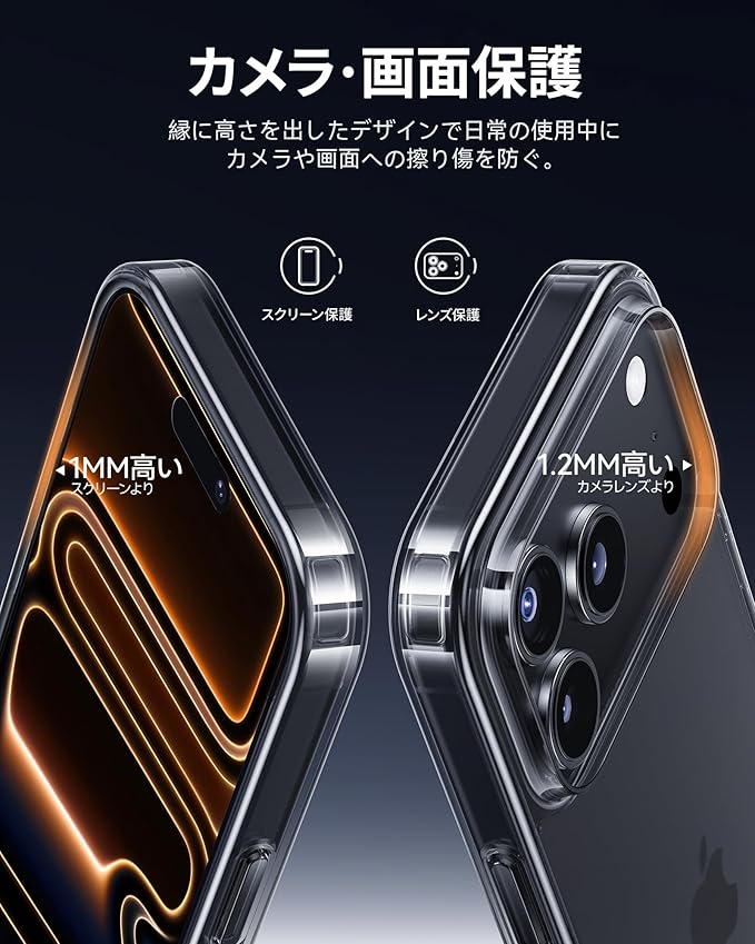 【精密なカットアウト・一体感抜群】アイフォン17Pro Max本体にあわせて精巧に製造しておりますので、本体との誤差はありません。ケースを装着したままスムーズに操作できるのはもちろんのこと、本体そのままの押し心地を実現しています。ケースがレンズとスクリーンよりそれぞれ1.2mmと1.0mm高く設計されているため、効果的にスマホを保護することができます。