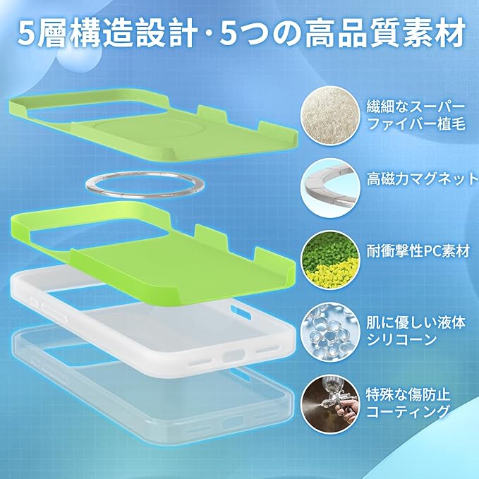 【層をなす、美しい設計】異なる特性を持つ素材を層のように重ねることで、強さと美しさをひとつにまとめ上げました。外側の肌なじみのよい液体シリコン、中間の変形を防ぐ硬質PC、内側の本体を傷つけないマイクロファイバーがそれぞれの役割を果たし、さらに表面の特殊コーティングが洗練された質感と清潔さを長くキープ。これらが調和することで、他にはない握り心地と美しい保護を実現します