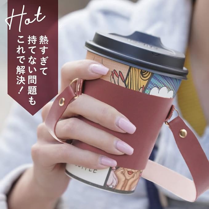 【持ち歩きに便利】 ストラップがあることによって、荷物が多い日も、カバンの中から家の鍵を出す際も、財布を出してレジで支払いをする時も、突然の雨で傘をささないといけない時も慌てずに済みます。 また、持ち歩きに便利なかさばらないサイズと軽量設計。お出かけ用のバッグ、通勤バッグに常にしのばせておくことができます。 持ち歩く際の折り畳んだ時のサイズは、横12.5cm、縦8cm、厚み1.5~2cm程度。重量もわずか36gと、とてもコンパクトです。 カップホルダーはトール、グランデサイズにピッタリなサイズ感です。(ショート、ミニサイズの場合はサイズが合わないこともございますので、予め画像のサイズにてご確認くださいませ。) 素材はPUレザー(フェイクレザー)なので、濡れてしまった場合も、万が一こぼしてしまった際も、気にせず拭き取ることができます。