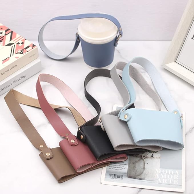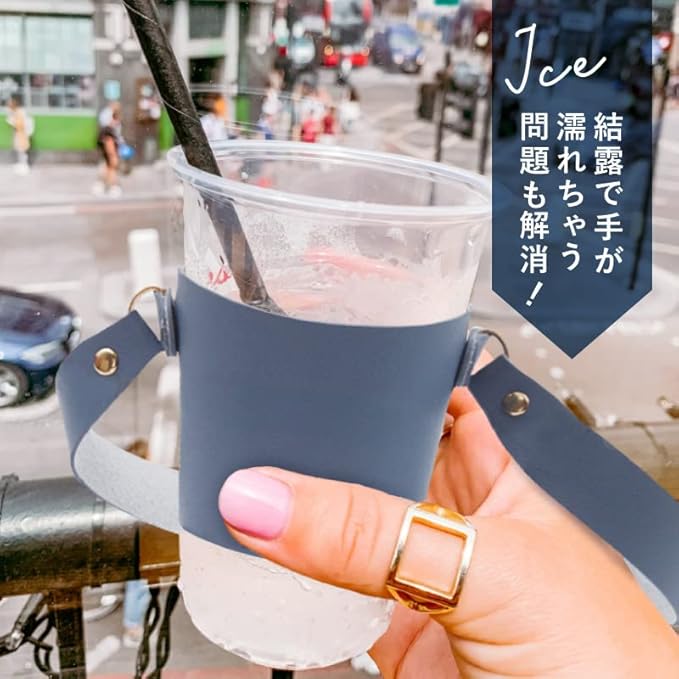 【コーヒーカップを入れる専用のホルダー】 こんなお困りごと、ありませんか? ・コーヒーカップが熱くて持てない ・コーヒーを買ったものの、常に手で持たないといけないので、飲み切るまで大変 ・コーヒーを持ったままウィンドウショッピングができない。お店に入れない。 ・カップを持ったまま傘をさしたり、ベビーカーを押すのが大変過ぎる ・常に手に持ったままなので、ちょい置きしたい ・一人の時は「ちょっと持ってて」と頼める相手が居ないので、大変 等々、 そんなお悩みを解決してくれるのがこのカップホルダーのアイテムです。 【持ち歩きに便利】 ストラップがあることによって、荷物が多い日も、カバンの中から家の鍵を出す際も、財布を出してレジで支払いをする時も、突然の雨で傘をささないといけない時も慌てずに済みます。 また、持ち歩きに便利なかさばらないサイズと軽量設計。お出かけ用のバッグ、通勤バッグに常にしのばせておくことができます。 持ち歩く際の折り畳んだ時のサイズは、横12.5cm、縦8cm、厚み1.5~2cm程度。重量もわずか36gと、とてもコンパクトです。 カップホルダーはトール、グランデサイズにピッタリなサイズ感です。(ショート、ミニサイズの場合はサイズが合わないこともございますので、予め画像のサイズにてご確認くださいませ。) 素材はPUレザー(フェイクレザー)なので、濡れてしまった場合も、万が一こぼしてしまった際も、気にせず拭き取ることができます。 【こんなメリットも・・】 ストラップの付いたバッグタイプだから便利なのは勿論ですが、 それ以外にも、カップの保護という観点からも便利なポイントが。 猫肌さんのあるある、熱くて持てないからホットドリンクを買うのを躊躇してしまう問題、 アイスドリンクを買ったものの、結露でべちゃべちゃで手が濡れてしまう問題も これで解決できます! 【大人カラーの6色展開】 ファッションを邪魔しない落ち着いた大人カラー。 ブラック(黒色)、モカ(茶色)、グレー、ペールブルー(青)、ライトブルー(水色)、ダスティーピンク(ピンク) 6色展開でつい”色ち買い”だってしたくなってしまう可愛さです。 【別シリーズ】 別シリーズで、ホルダーの底部分が付いた、ボックス型のものも販売しています。 底が付いているので、コンビニやコーヒーショップで購入するドリンクカップだけでなく、 自動販売機で購入した缶ドリンク缶を入れたりすることができます。
