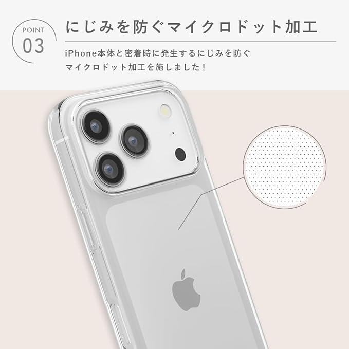 「PG-25DTP01CL」は、iPhone本体の美しさを最大限に活かすクリアタイプのiPhone17ProMax 用 クリアソフトケースです。しなやかで柔軟性に優れたTPU素材で端末本体をキズや衝撃から護ります。ケースと本体の貼り付きを防止するため、ケース内側にマイクロドット加工を施しています。ケースを付けたままワイヤレス充電が可能です。お手持ちのストラップを付けて落下を防止できるストラップホール付き。