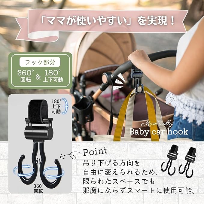 「ママが使いやすい」を形にした、360度回転&180度上下可動のベビーカーフック。荷物を掛ける方向を自由に調整できるため、限られたスペースでも邪魔にならずスマートに使用可能です。軽量ながらも頑丈な設計で、バッグや買い物袋をしっかりホールド。取り付けも簡単で、忙しいお出かけ時でも快適に使えます。シンプルながら洗練されたデザインで、日常の育児シーンをスタイリッシュにサポートします。