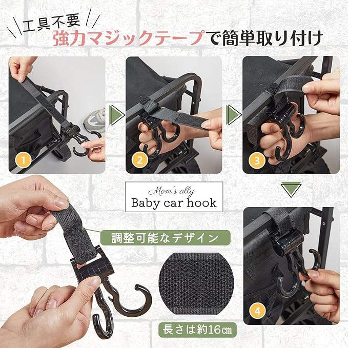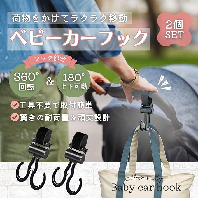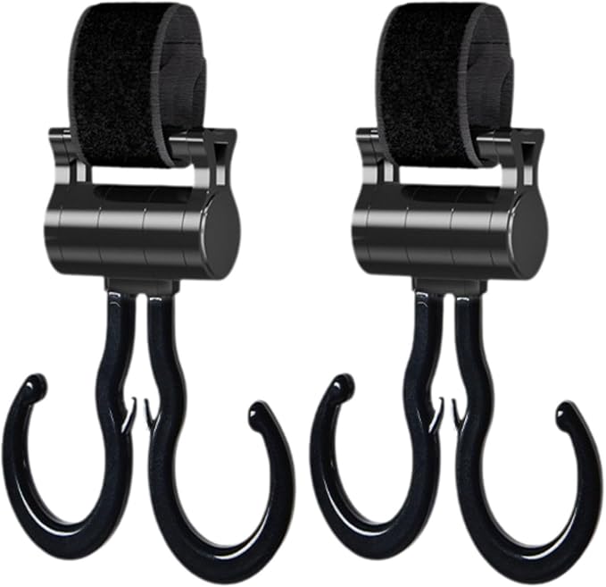 ベビーカーでの荷物移動を快適にする、360度回転&180度可動のベビーカーフック。工具不要で簡単に取り付けられる強力マジックテープ式で、しっかり固定しながら自由な角度調整が可能です。バッグや買い物袋を掛けても安定する頑丈設計で、日常使いにぴったり。2個セットでお出かけ時の荷物整理にも便利。スタイリッシュで実用的なデザインが、育児中のママやパパをスマートにサポートします。