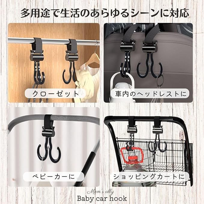 ベビーカーはもちろん、車内のヘッドレストやショッピングカート、クローゼットなど、さまざまな場所で活躍する多機能ベビーカーフック。強力マジックテープで簡単に取り付けでき、重い荷物も安定して支えます。360度回転&ダブルフック設計により、吊るす方向を自由に調整可能。使うシーンを選ばず、毎日の生活をスマートにサポートする便利アイテムです。おしゃれで機能的なデザインは、ギフトにも最適です。