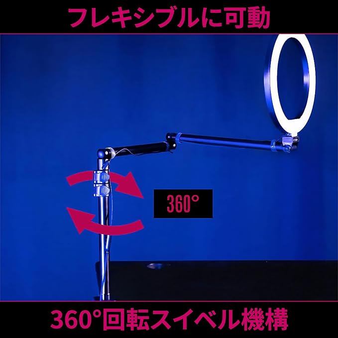 【180 稼働ヘッドと360 回転でスペースを有効活用】支柱部分は360 回転スイーベル機構搭載。高さ調整も簡単に可能なイージークリップデザインです。ヘッド部分は180 調整可能で、マイクを逆さに設置することができ、限られたスペースを有効活用して最適な配信をサポートします。