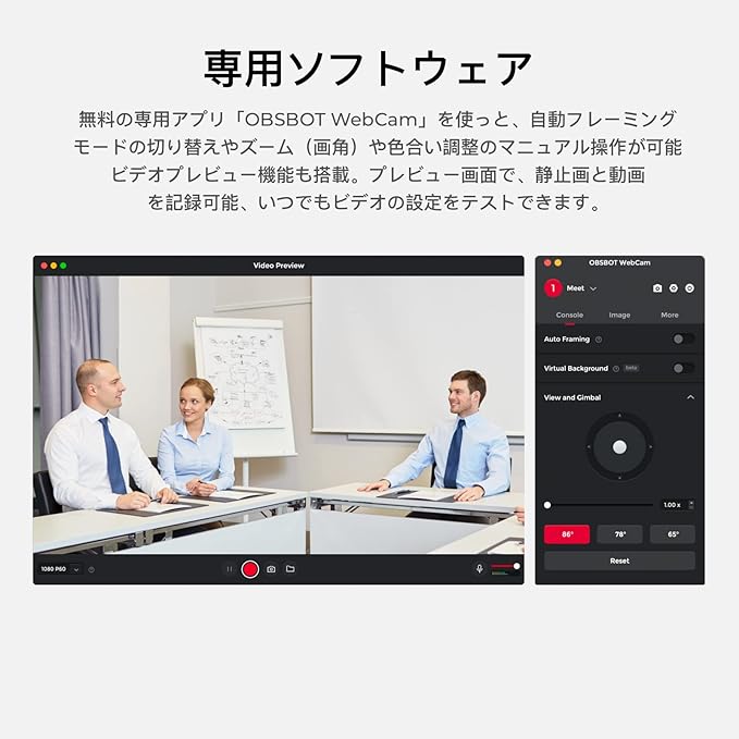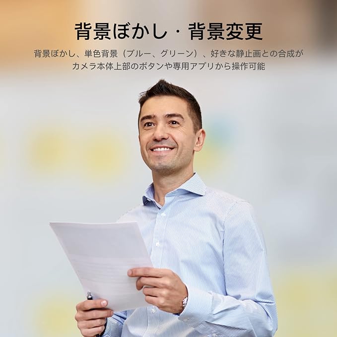 【直観操作】オートフレーミング・背景ぼかしもボタン一つで変更できます。また、カメラ本体を回転させるだけで、画像を横向きと縦向きに瞬時に切り替えることができ、InstagramやFacebook向けの動画もPCで簡単に撮影できます。