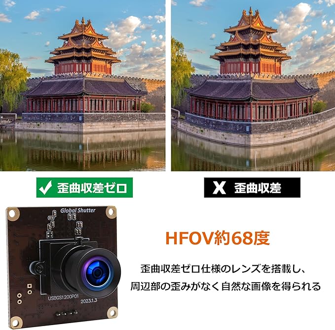 【68 視野角 歪曲収差ゼロ】HFOVは約68度。68 の視野角により遠くのものがしっかりと見えるようになります。そして、歪曲収差ゼロ仕様のレンズを搭載し、周辺部の歪みがなく自然な画像を得られます。