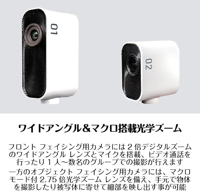 フロント フェイシング用カメラ 01とオブジェクト フェイシング用カメラ 02には、Sony Starvis センサーを搭載、最大4K UHDの超高解像度で鮮明なビデオをキャプチャーする事が可能で、フロント フェイシング用のカメラ 01には、2倍デジタルズームのワイドアングル レンズやマイクを搭載しており、ビデオ通話を行ったり1人~数名のグループでの撮影が行える