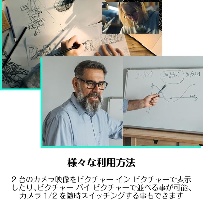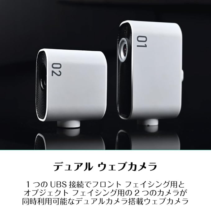 フロント フェイシング用カメラ 01とオブジェクト フェイシング用カメラ 02の合計2つのウェブカメラを備えており、1つのUSBインターフェイスでPCと接続して、2つの映像を同時に画面上に表示したり、表示する映像を複数のパターンで切り替える事が可能なデュアルカメラ搭載のウェブカメラ