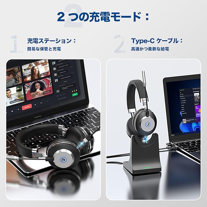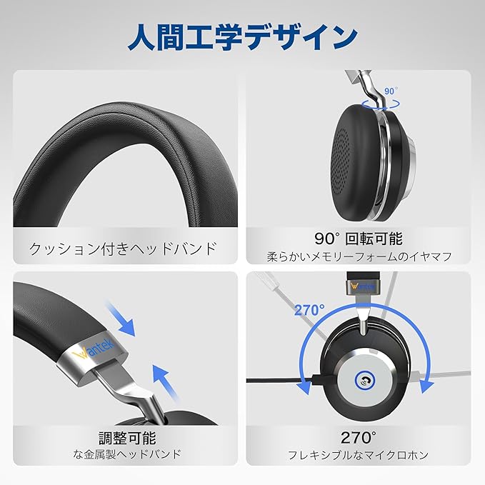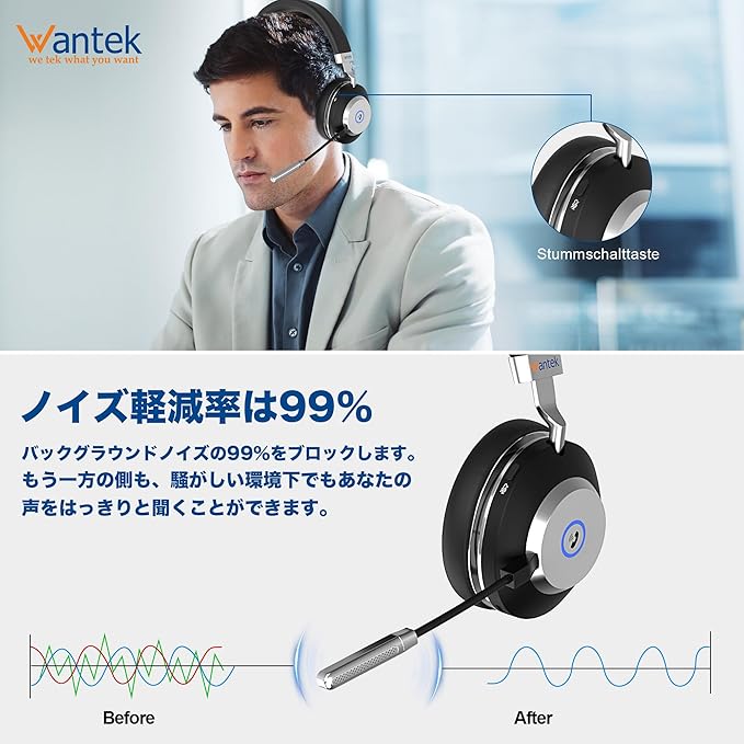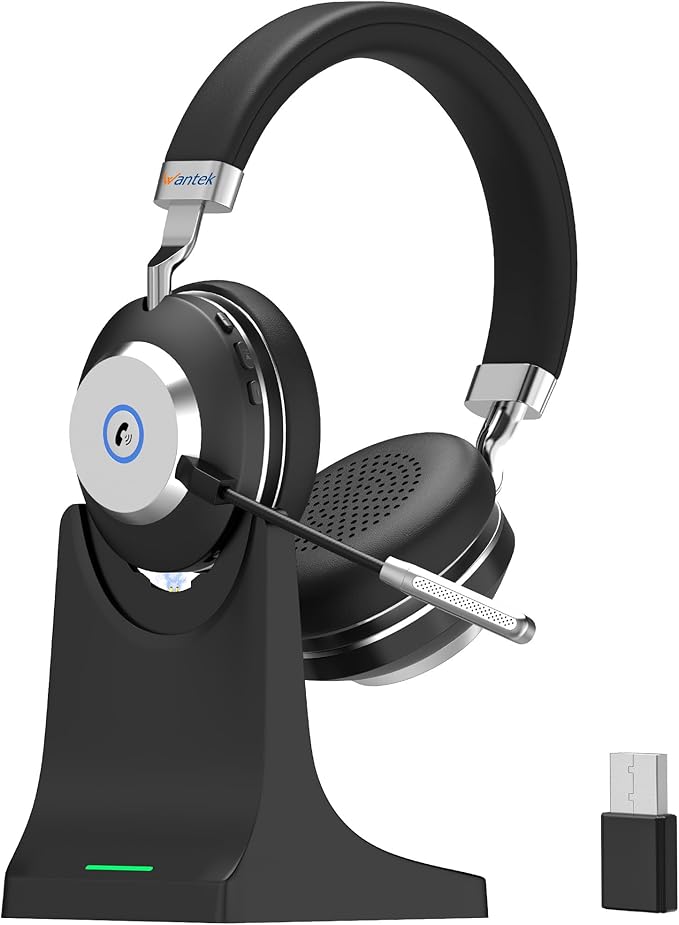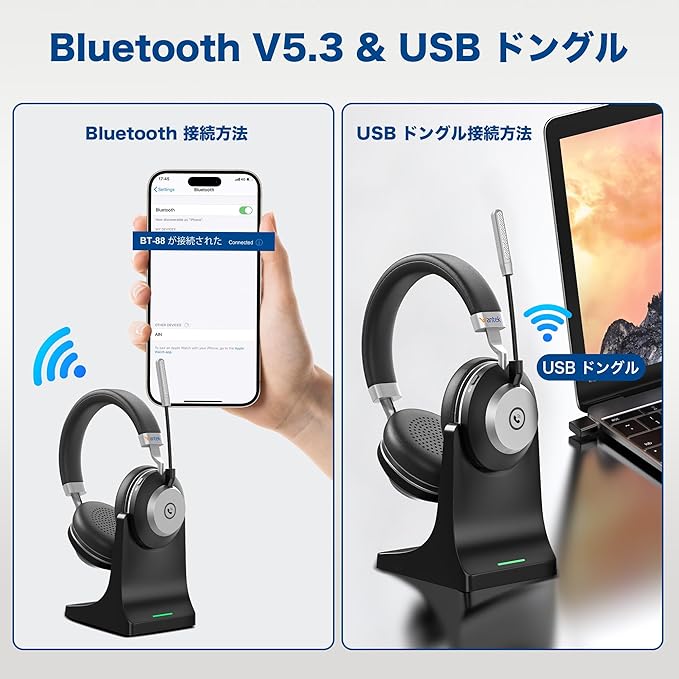 Wantek ワイヤレスヘッドセット Bluetoothヘッドセット 両耳 USBドングル付き 音量調節/単一指向性 マイクミュート機能搭載 ノイズキャンセリング 最長50時間通話 コンピュータ/ノートパソコン/PC/iPhone/Android/携帯電話/Zoom 対応の Bluetooth 5.3 ヘッドホン(スタンド付き) (MBTC-882)