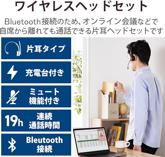 スタンド代わりにもなる、充電台付きのオーバーヘッドタイプの片耳ヘッドセットです。周囲の音が聞こえやすく、長時間の使用でも疲れにくい仕様です。Bluetooth(R)接続のためワイヤレス通話が可能で、オンライン会議などの際に自席から離れても通話が可能です。