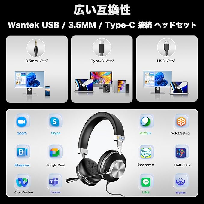 【より広い適用性】USB、3.5 mm、Type-Cプラグを搭載し、PC、Mac、IOS、Androidの各種システムと設備を満たすことができ、オフィス、オンライン授業・学習、在宅勤務、Web会議、Skypeチャットコールセンターなどのさまざまな場面に適しています。
