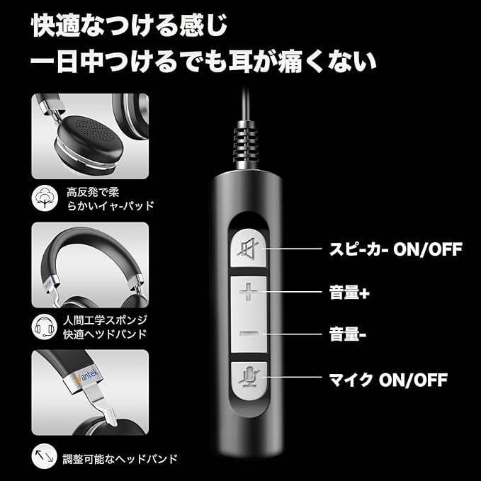 【簡単で便利なコントロール】ヘッドセットケーブルにはイヤホンコントローラが搭載されており、音量、スピーカーの静音、マイクの静音を簡単に制御することができます。