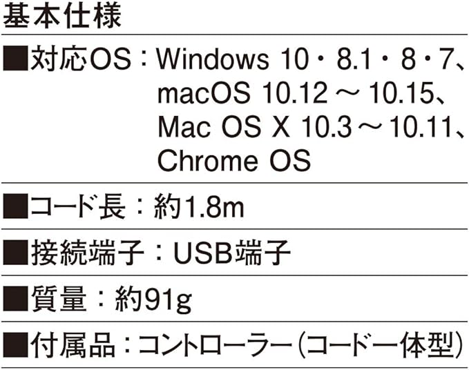 【 仕 様 】■ 対応OS:Windows10/8.1/8/7、macOS10.12~10.15、Mac OS X 10.3~10.11、Chrome OS■ コード長:約1.8m■ 接続端子:USB端子■ 質量:約91g■ 付属品:コントローラー(コード一体型) ≪マイク部≫■ 方式:コンデンサー方式■ 指向性:双指向性■ 周波数帯域:20~20000Hz■ インピーダンス:2.2kΩ