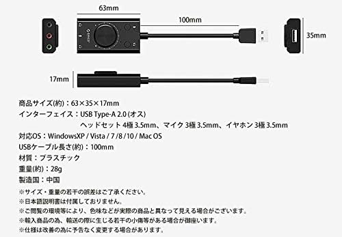 インターフェイス:USB Type-A 2.0 (オス)、ヘッドセット 4極 3.5mm、マイク 3極 3.5mm、イヤホン 3極 3.5mm 対応OS:WindowsXP / Vista / 7 /8 /10 / Mac OS USBケーブル長さ(約):100mm