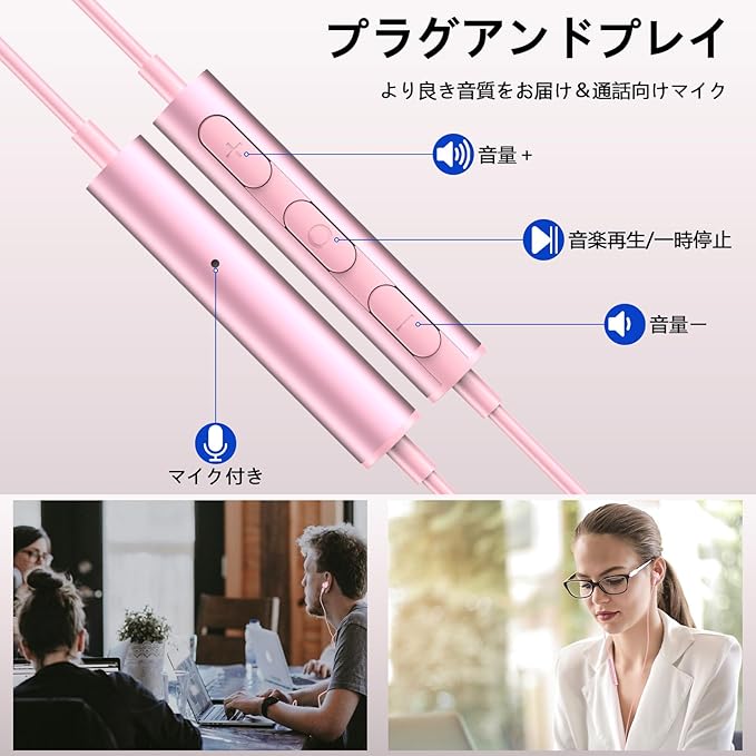 ASKUBSKU イヤホン usb マイク付き 有線 通話可 音量調整 HIFI音質 2.4M長さ インナーイヤ型 両耳 ヘッドホン ヘッドフォンps4 ps5 pc windows mac Chrome テレワーク リモートワーク オンラインzoom Web会議用usb aイヤフォン いやほん 収納ケース ギフト ピンクearphones headphones earbuds