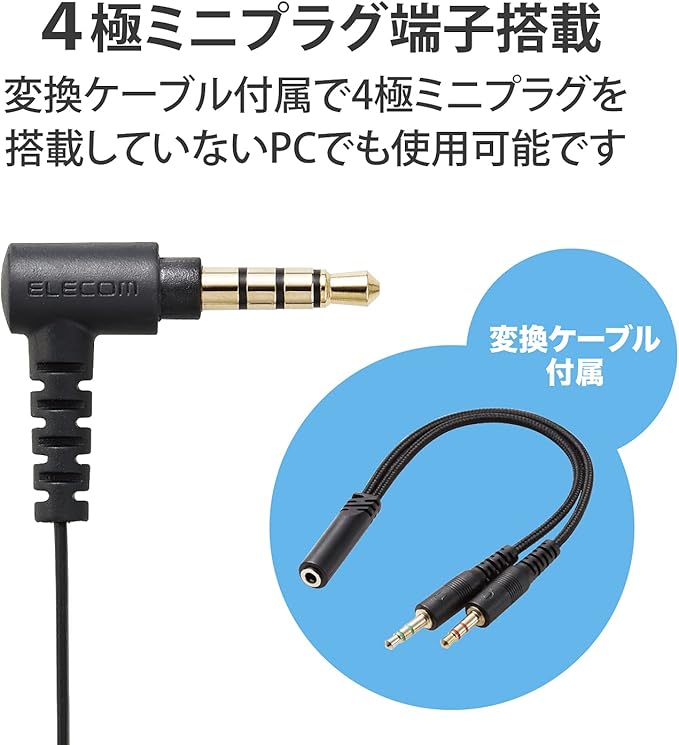 φ3.5mm 3極ミニプラグ 2(マイク 1、ヘッドホン 1)の変換ケーブルが付属していますので、4極ミニプラグのヘッドセット端子を搭載していない従来のパソコンでも使用可能です。