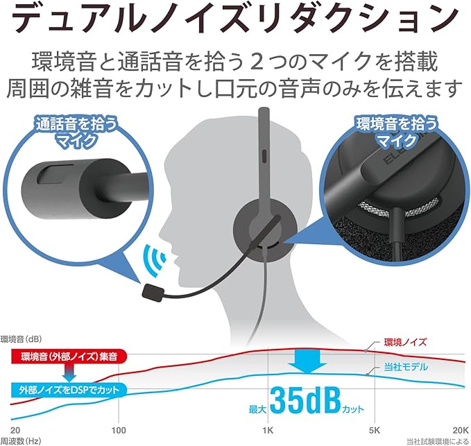 ■周囲の雑音(環境音)を拾うマイクと、口元の音声(通話音)を拾うマイクの2つのマイクを搭載し、DSPで音声処理するデュアルマイクノイズリダクションシステムにより、不要なノイズをカットし口元から発した音声のみをクリアに相手に伝えます。