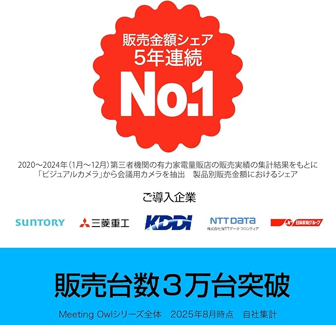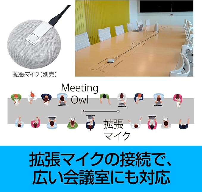 本製品はMeeting OWLで使える拡張マイクです。Meeting OWLは、360度カメラとマイク・スピーカーを一体化したハイブリッド会議用デバイスです。