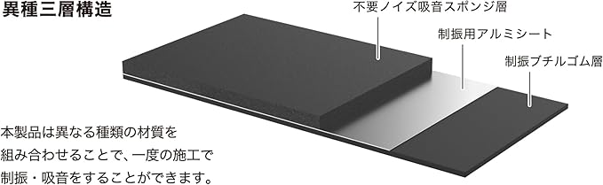 ヴァージンブチルゴムとアルミシートと吸音スポンジで高い制振・吸音効果を発揮。