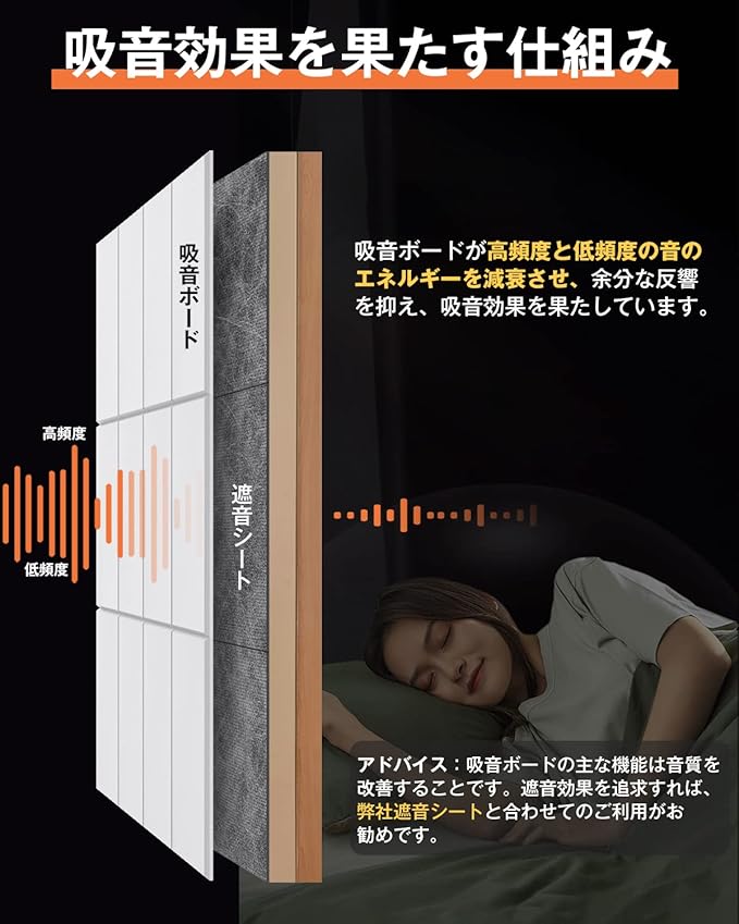 【使用上のアドバイス】吸音パネルの主な目的は音質の向上であり、室内の壁を70%以上覆うと効果がより顕著になります。より良い遮音効果を追求する場合、Moon Riverの防音シートとの併用がお勧めです。