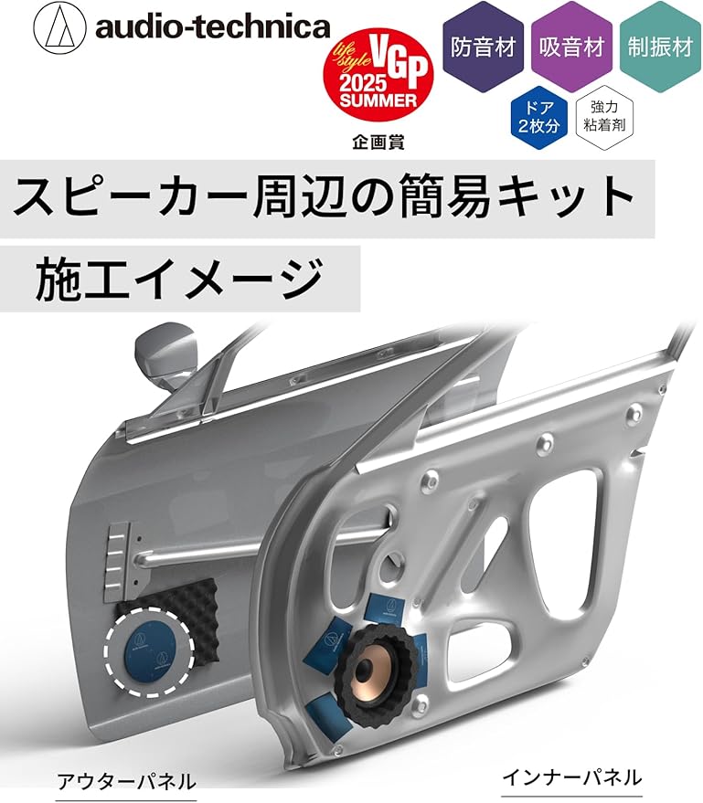 オーディオテクニカ AT-AQ474 ドアチューニングスターターキット デッドニングキット 制振 吸音 防音 ドア 内張り スピーカー背面 インナー パネル アウターパネル