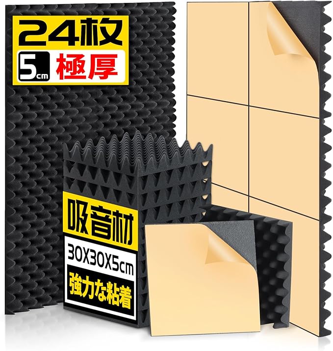 24枚 自己粘着吸音材 極厚防音材 粘着剤付き 30x30x5cm 自粘防音シート 壁 室 吸音パネル 遮音シート 防音パネル 高密度吸音スポンジ 室内装飾 楽器 消音 吸音対策 黒(エッグ形)