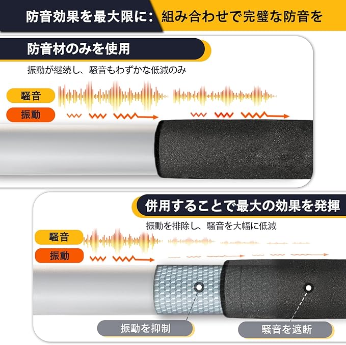【使用方法】:騒音は物体の振動によって発生し、空気中を伝播します。一般的な防音材は空気中を伝わる音を遮断する方式ですが、当社の制振材は根本的な解決方法を採用。騒音源に直接貼り付けることで振動自体を抑制し、発生する騒音を大幅に低減します。最適な防音効果を得るためには、まず本制振シートを騒音源に貼り付けて振動を抑制し、その後、通常の吸音材で残りの騒音を遮断することをお勧めします