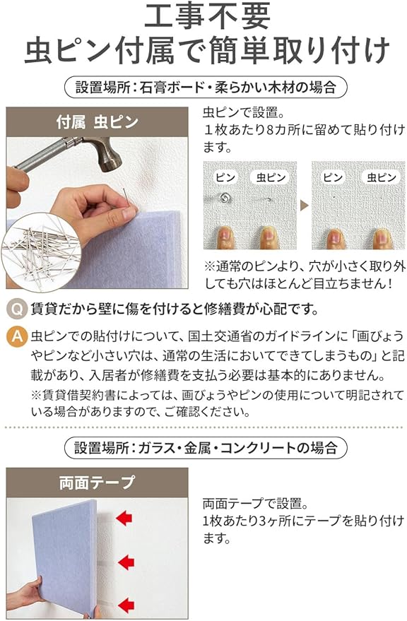 ✅【 ご注意 】こちらの製品は音の反射を吸収する「吸音材」です。音をさえぎる「遮音材」ではございません。遮音が必要な場合、石膏ボード、合板、遮音シートなどと合わせてご利用することで、遮音と吸音を合わせたしっかりとした「防音」を作ることができます。