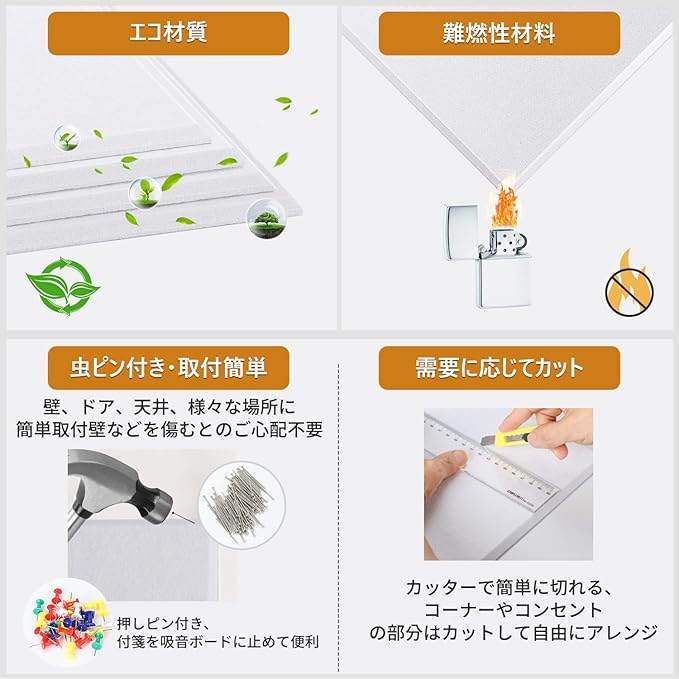 【幅広い用途】吸音パネルは取り付け用の虫ピン付き、壁、ドア、天井に簡単に取り付け可能です。虫ピンなので、壁などを傷まずに取り外せます。寝室、ピアノ練習室、レコーディングルーム、オフィス、会議室など幅広く活躍しています。