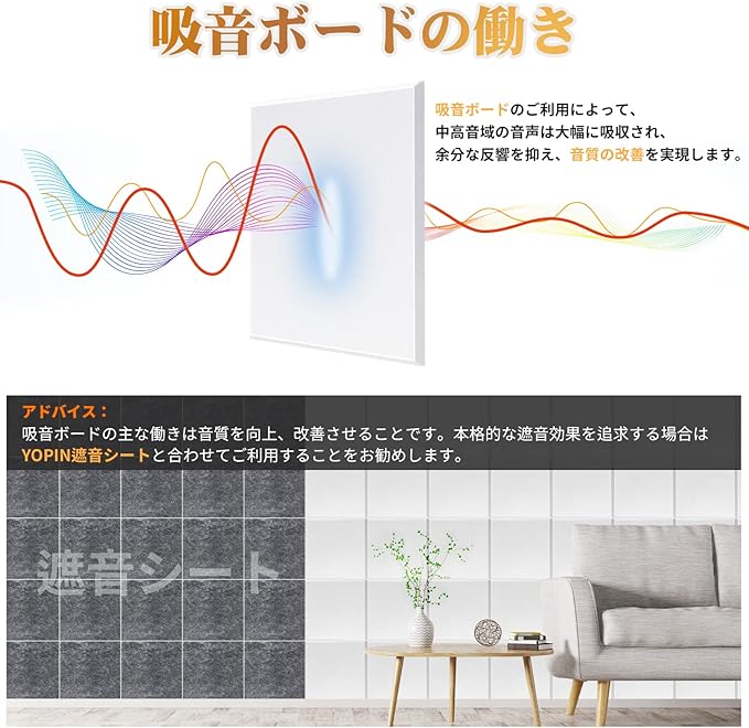 【アドバイス】理想的な吸音効果を得るためには、吸音シートが部屋の壁の70%以上を覆うことを推奨します。また、より良い吸音効果を追求する場合、YOPIN防音材との併用をお勧めします。