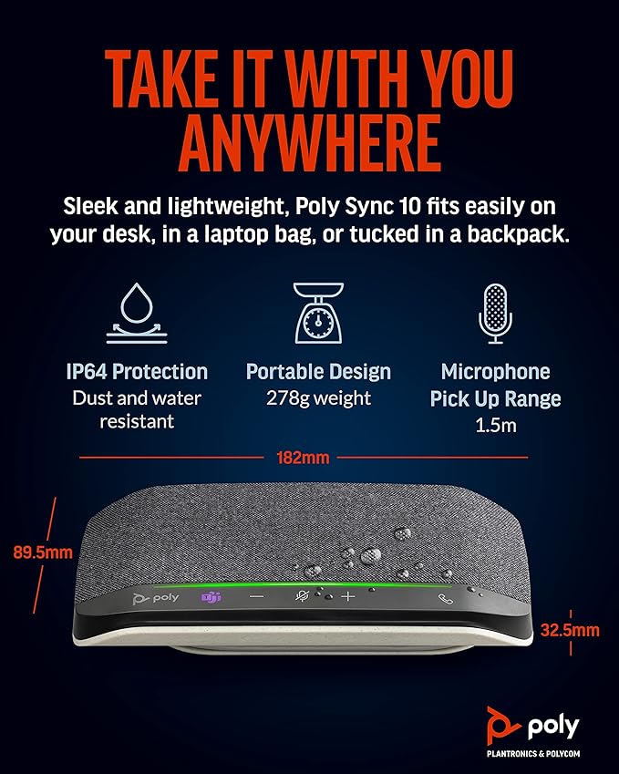 Poly (Plantronics)スピーカーフォン USB-A/USB-C接続 会議 テレワーク PC/Mac/スマートフォン対応 Microsoft Teamsボタン搭載 Teams/Zoom対応 小型 IP64防水防塵 簡易パッケージ Sync 10 マイク集音範囲 最大 約1.5 m